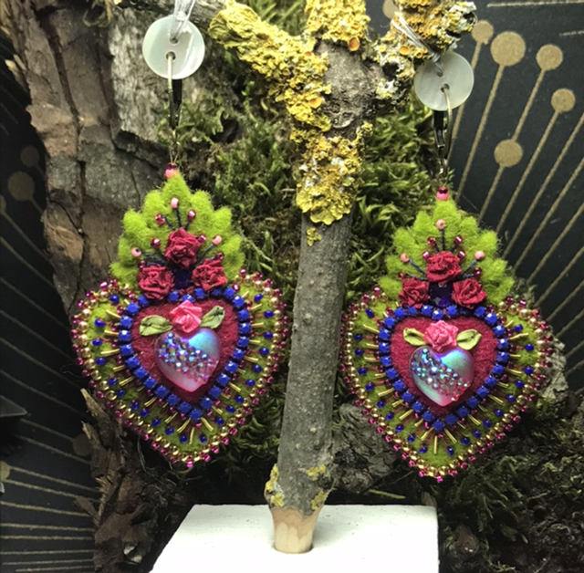 Broche en feutrine de laine brodée 100% mérinos,broderie au ruban de soie,strass,cannetille ancienne,perles et mini rocailles.