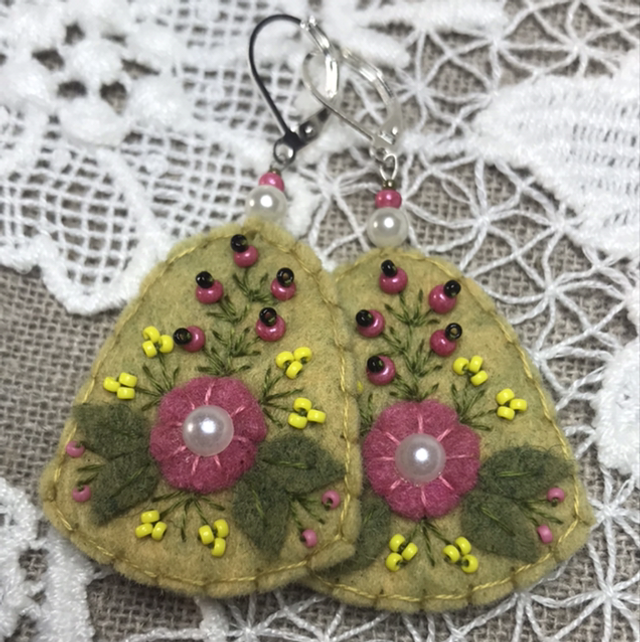 Boucles d’oreilles en feutrine de laine, perles et mini rocailles.