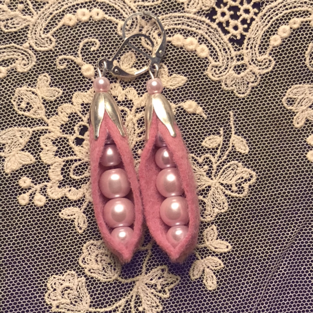 Boucles d’oreilles en feutrine de laine et perles nacrées.