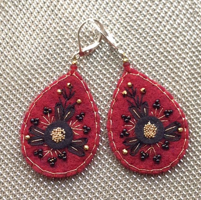 Boucles d’oreilles en feutrine de laine, ruban et mini rocailles.