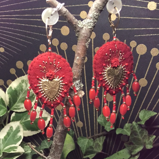 Boucles d’oreilles en feutrine de laine 100% mérinos, rose au ruban de soie, cœur en métal doré, perles et mini rocailles.