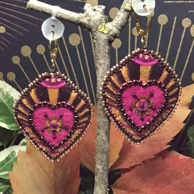 Boucles d’oreilles en feutrine de laine 100% mérinos, wax pailleté, strass, sequins fleurs, mini rocailles.