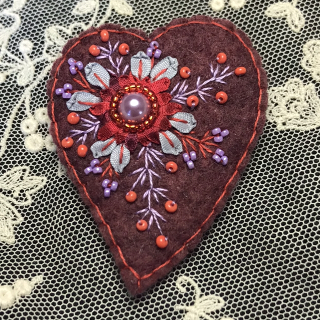 Broche en feutrine de laine brodée, broderie au ruban de soie, perle nacrée et perles de rocaille.