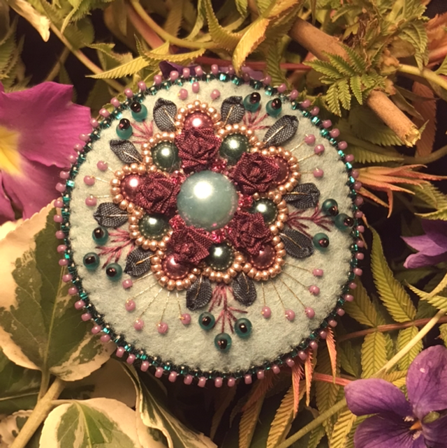 Broche en feutrine de laine 100% mérinos, broderie au ruban, strass, perles et mini rocailles.