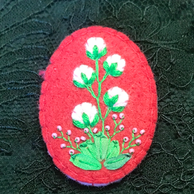 Broche en feutrine de laine brodée,ruban de soie et perles de rocaille.