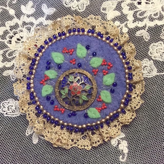 Broche en feutrine de laine brodée,bouton ancien émaillé,dentelle et perles de rocaille.