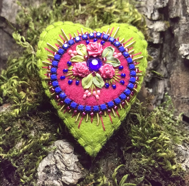 Broche en feutrine de laine brodée 100% mérinos,broderie au ruban de soie,strass et mini rocailles.