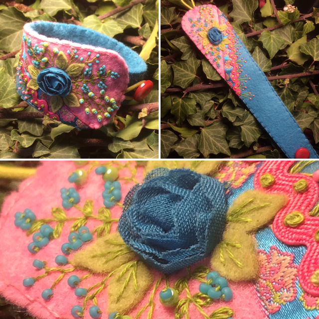 Manchette en feutrine de laine brodée. Fleur en tissu, bouton nacre,perles de rocailles, croquet et ruban.