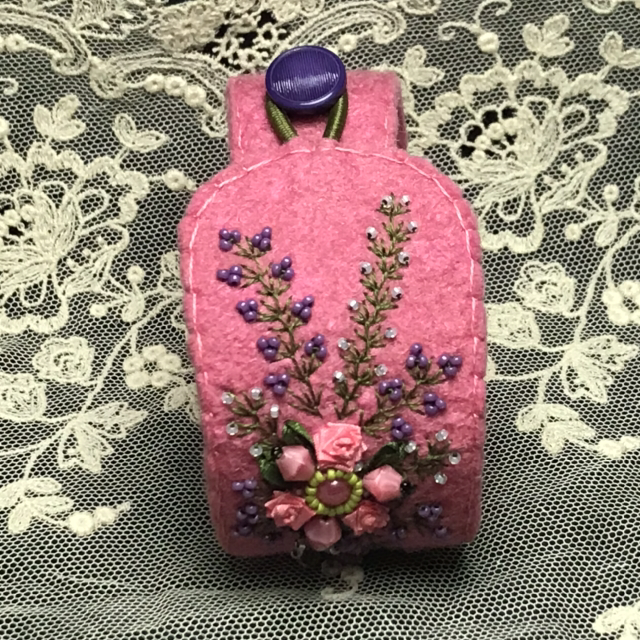 Manchette en feutrine de laine brodée, perle nacrée, broderie au ruban, perles en verre et perles de rocaille.